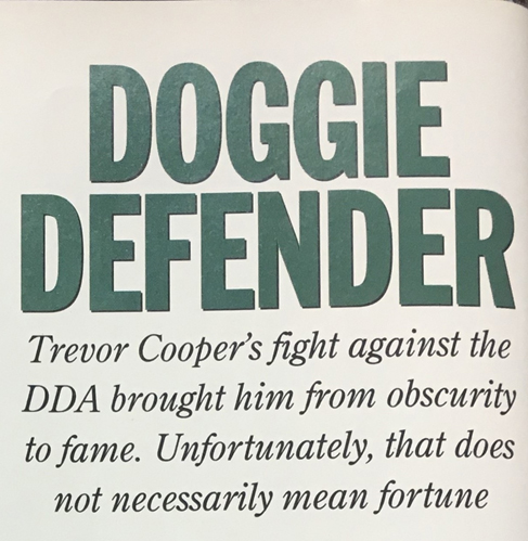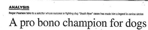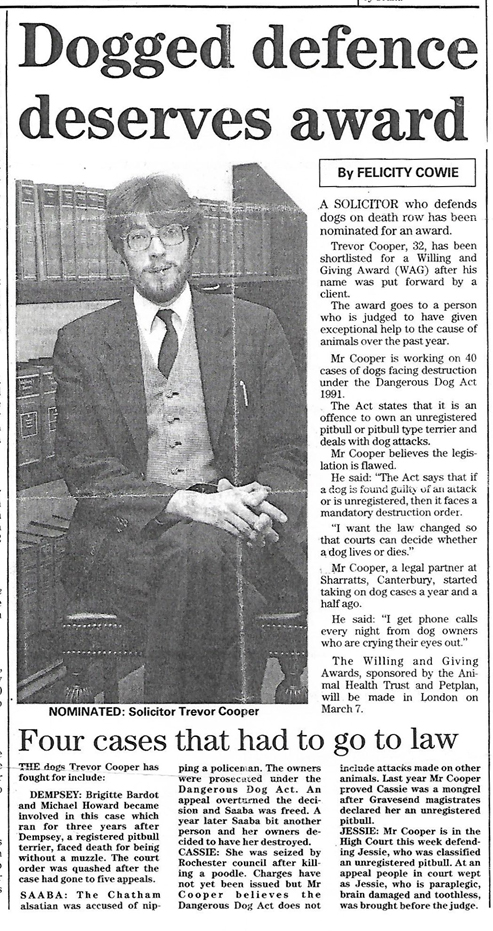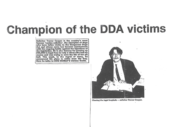 “… in UK canine circles Cooper’s name is legendary” “Cooper’s reputation in the canine world is unsurpassed. He is an acknowledged expert on dog law, lectures on the subject, sits on the Dangerous Dogs Act Reform Group and has given evidence to parliamentary groups on this subject” “He has probably saved more dogs from ‘Death Row’ than any other lawyer and is the hero of dog lovers everywhere” “A dog’s best friend is his lawyer”