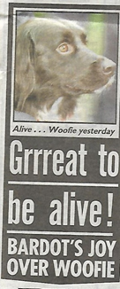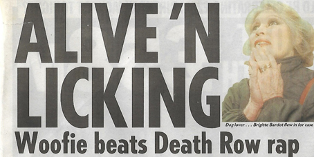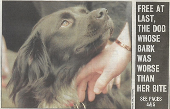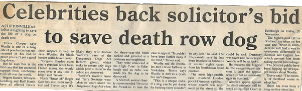 20th November 1998 At the High Court in Edinburgh we successfully overturned the destruction order. We were front page news in most of the national newspapers in Great Britain. A press conference was hastily arranged and it was intended that Brigitte would attend. However, she became ‘indisposed’ so I had to tell the hoardes of press that they were stuck with just Woofie and me. Undeterred they were anxious to get pics of the dog for the morning papers. Woofie took it all in her stride.