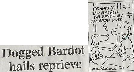 I spoke to Brigitte Bardot’s lawyer to tell him the outcome of the case. He was Francois Kelidjian, based in Paris, and he looked a bit like Sacha Distel. He got back to me with the message from Brigitte Bardot that she would like to invite me to France so she could give me a kiss. Despite this kind offer I never went – though I would meet her in person a few years later (see below…).